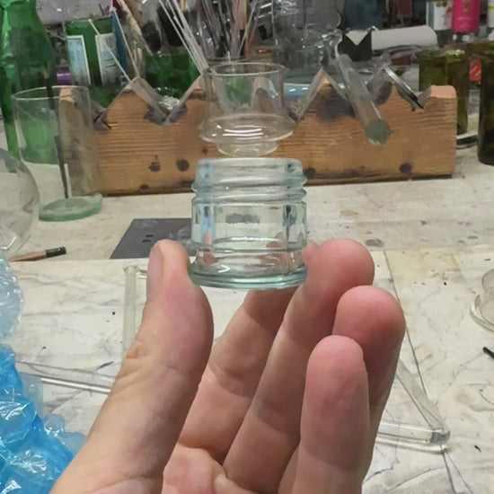 Clear/ blue recycled glass jar made from post consumer wine bottles.